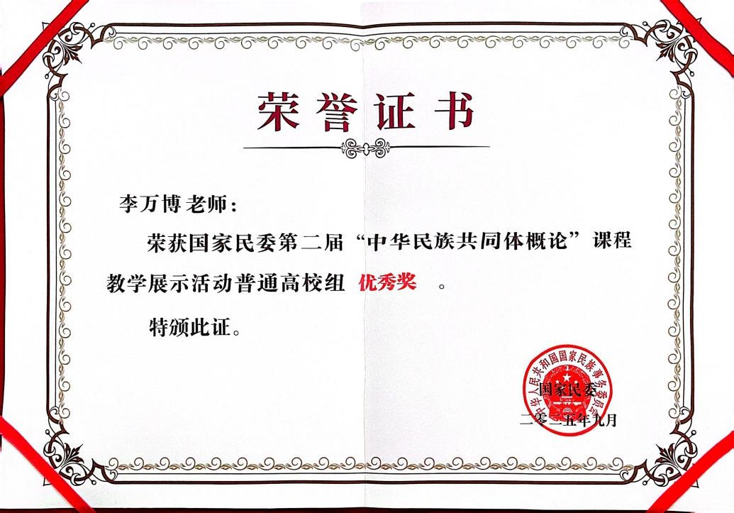 学校李万博老师荣获全国第二届“中华民族共同体概论”课程教学展示活动优秀奖