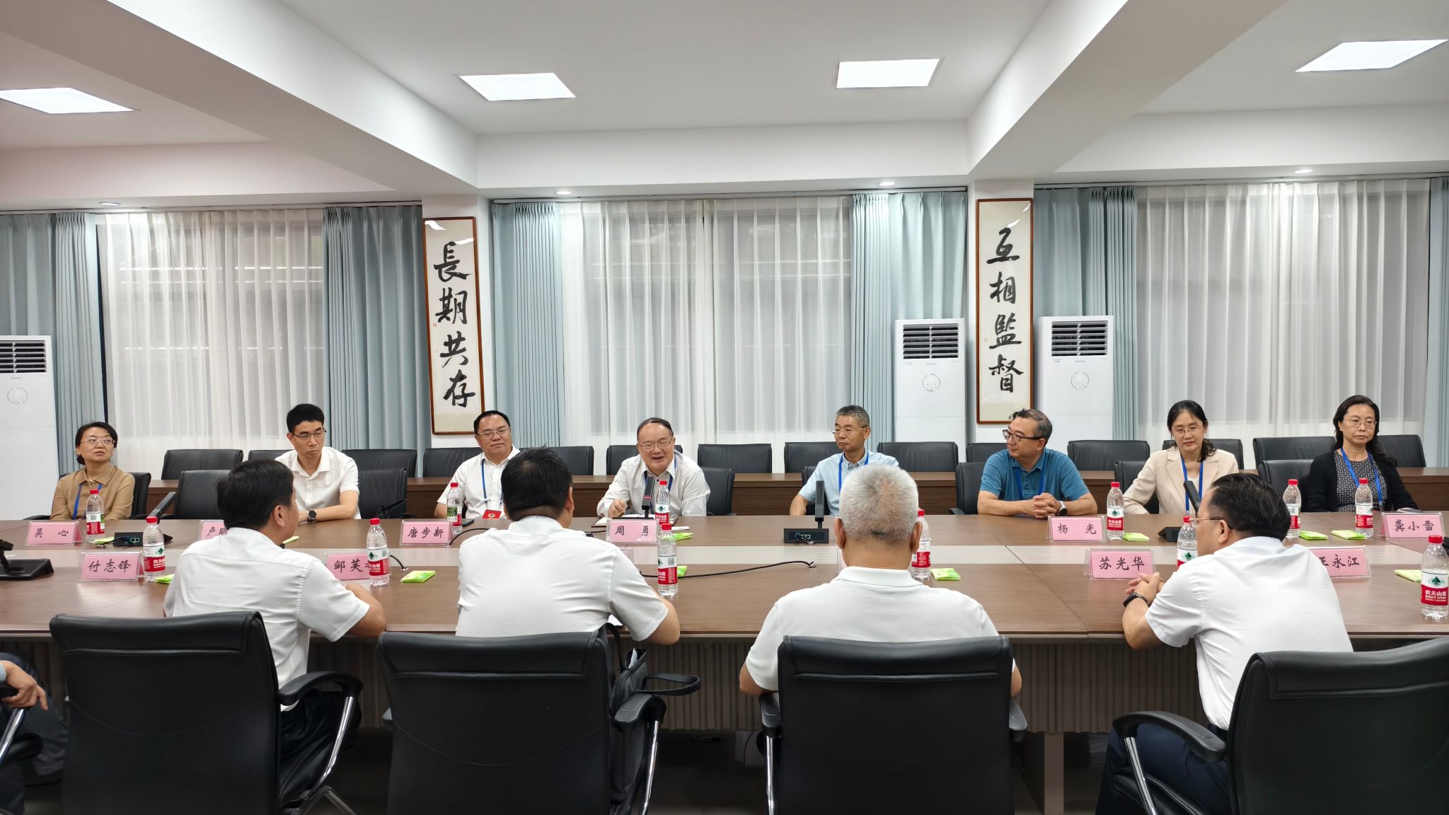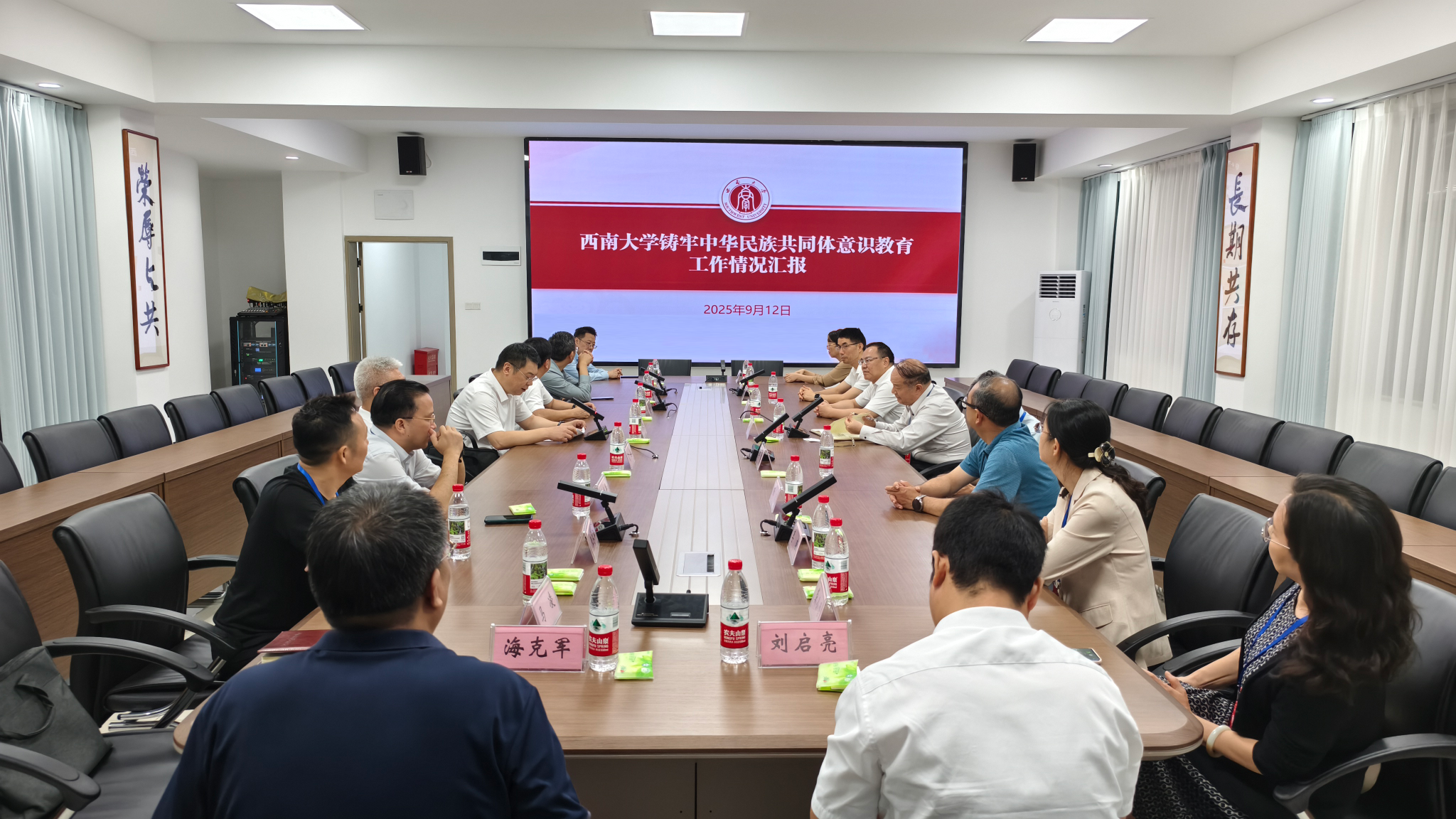 在同心楼,周勇及各政协委员听取学校开展铸牢中华民族共同体意识教育工作的情况汇报。武好明从整体机制、载体形式、理论阐释、依法管理等方面,介绍了学校铸牢中华民族共同体意识教育工作的主要做法,邹芙都介绍了学校民族学生培养的情况和部分科研情况。