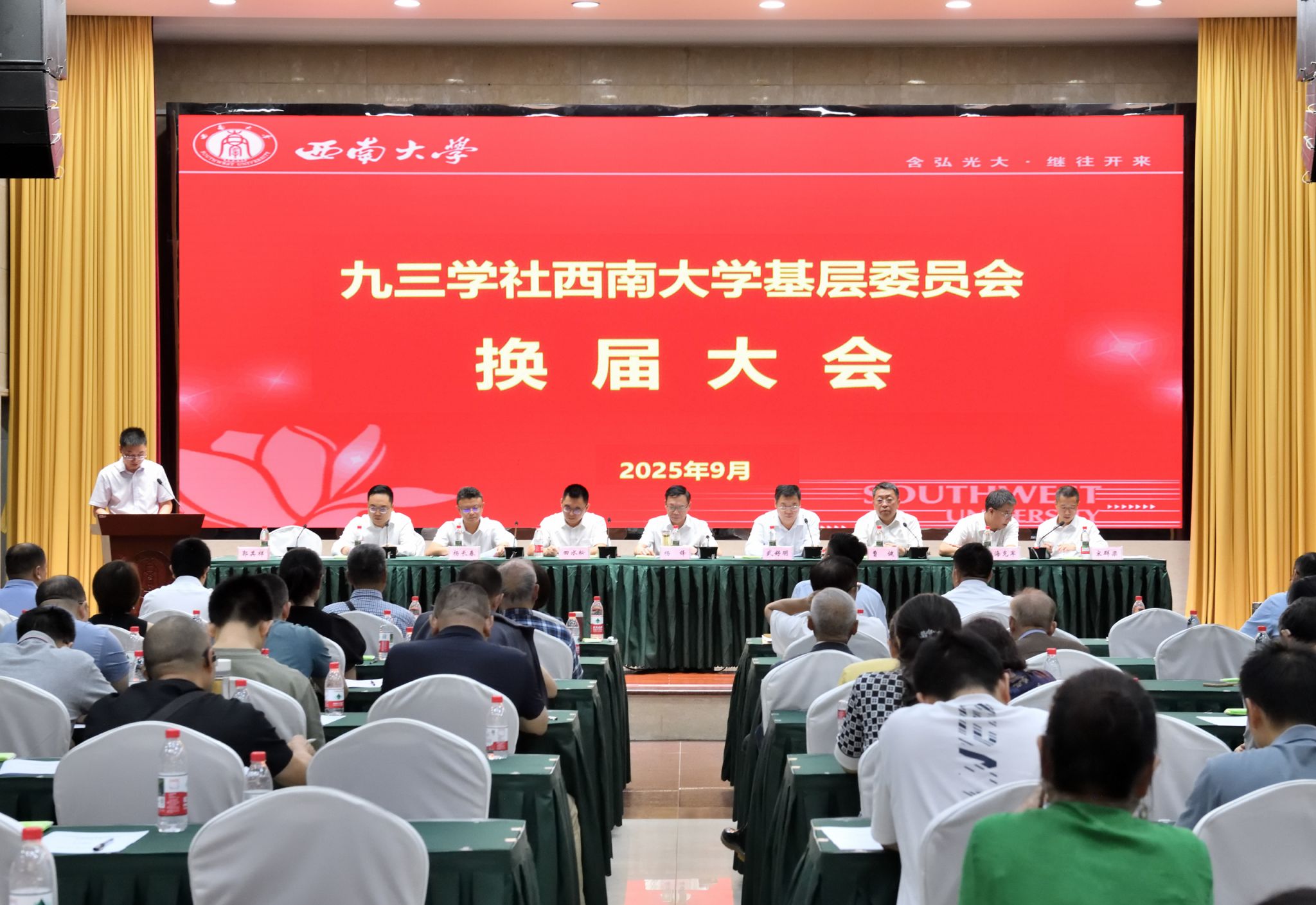 9月19日,九三学社西南大学基层组织举行换届大会。会议听取并审议了宋群梁主委代表第四届基层委员会所作的工作报告,选举产生了九三学社西南大学第五届基层委员会,郭其祥当选为主任委员,钱坤、刘琳东、高笑、胡军华、陈宏当选为副主任委员,晏妮、朱琳娜、李昊天、董朝菊、葛爱新为委员。九三学社重庆市委专职副主委田水松、组织处处长唐孝彬,中共北碚区区委常委、统战部部长杨锋,北碚区政协副主席、九三学社北碚区委主委曹健等到会祝贺指导。西南大学党委副书记武好明出席大会闭幕式并讲话。