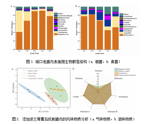 拥有千年历史的城口老腊肉是重庆知名特产、国家地理标志保护产品,其低温、高炕的传统工艺入选重庆市非物质文化遗产。本地高山猪肉在腌制后须悬挂2米以上,用青杠木是碳火炕制40余天,下炕后再放置2周,形成独特风味。课题组研究发现,炕房环境中的微生物群落决定了腊肉风味,特别是波兰青霉发挥的关键作用,其发泌的脂肪酶和蛋白酶促进风味物质的生产与富集。同时,波兰青霉还能降解炕制早期产生的苯类有害物质,提升产品安全性。通过人工添加该菌剂,可缩短上炕时间、提升口感而不改变风味。